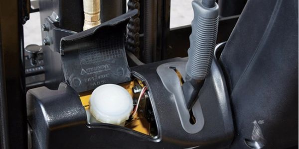A safety valve controls the speed of the fork when it is lowered and prevents it from dropping down in case of sudden hydraulics failure.